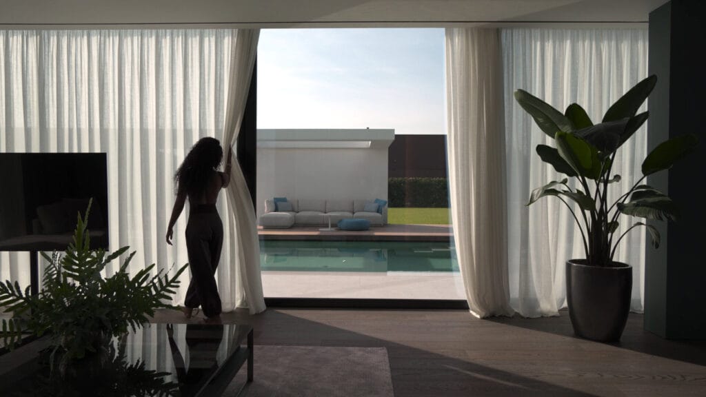 This means: automated lighting that follows circadian rhythms, silent and efficient climate control systems, integrated security without invasive visual elements, distributed audio in every room without visible speakers, motorized windows that adapt to solar conditions.